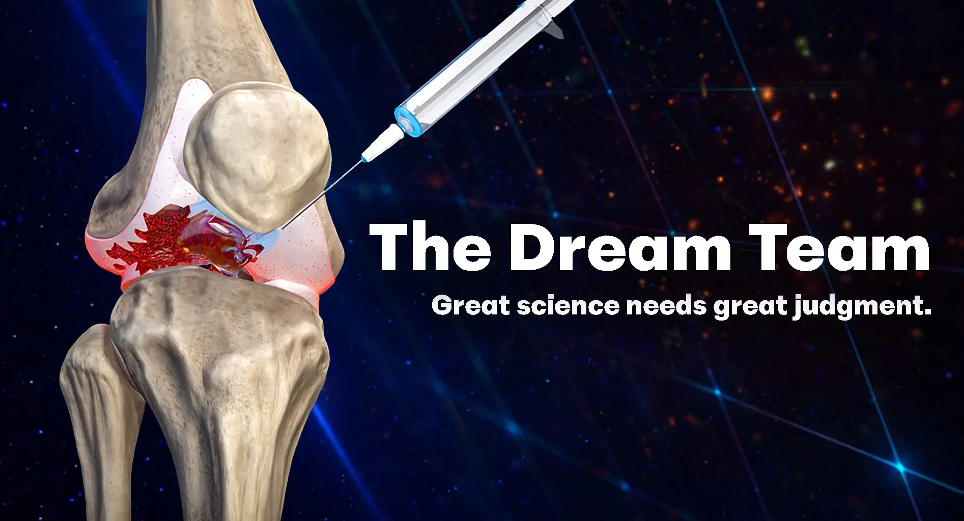 Our leadership combines world-class scientific expertise, decades of clinical experience, and a proven track record in biotech R&D with the first-principles thinking of biotech neophytes (our Founder and CEO). Our Board of Directors and Medical Advisory Board have dominated the last decade of osteoarthritis research (a combined 80 osteoarthritis clinical trials), developed FDA-approved biologics at major pharma companies, and raised millions in combined capital. This unique combination of traditional biotech experience with avant garde thinking of industry outsiders gives us a strategic advantage as we tackle a problem that the Big Pharma giants have failed to solve.